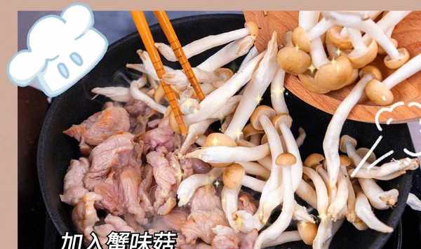 3少許油炒香肉片,加入蟹味菇,把蟹味菇炒軟,炒出汁水。