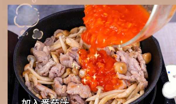 蟹味菇200g,豬肉片150g,番茄一個,番茄醬兩大勺,淀粉一勺。