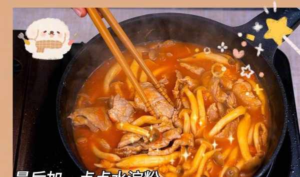 4加入番茄汁大火炒出香味之後,可以開小火,加一點水淀粉,收濃湯汁。