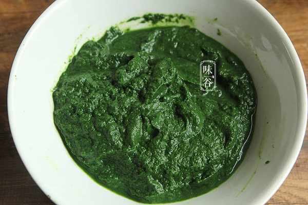 3、接下來做青團皮,艾草摘好嫩葉清洗幹凈,鍋中加入水燒開後放入小蘇打(是為瞭保持鮮綠)。放艾葉煮2-3分鐘,撈起來放冷水裡泡三分鐘,接著放到破壁機裡打出細膩的艾草泥。
