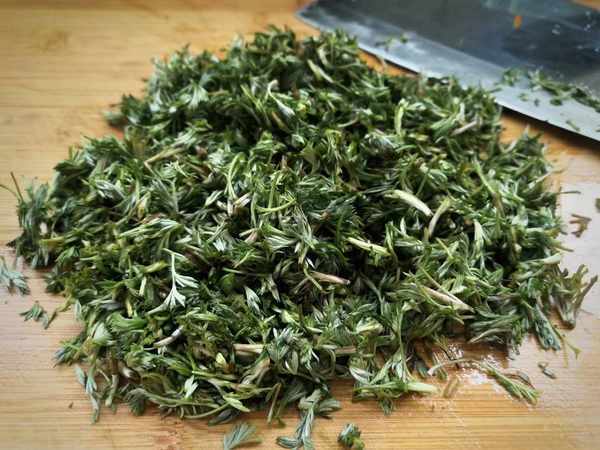 3、洗凈後撈出,控掉多餘水分,放在案板上面切成碎末,盡量切得小點,食用起來口感好。
