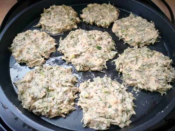 6、電餅鐺裡放入食用油預熱2分鐘,用勺子舀入適量面糊,攤開成幾個圓餅,開始煎餅。
