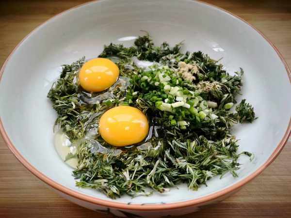 4、放在幹凈的大碗裡面,2根小蔥剝皮洗凈切成小段,放入白蒿上,打入2個雞蛋,少許鹽,胡椒粉,用筷子攪打均勻。