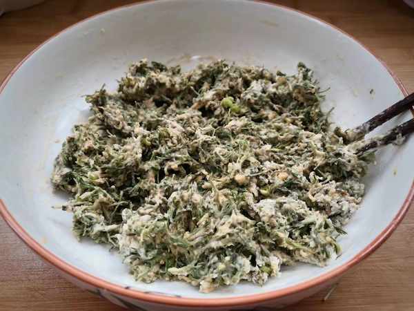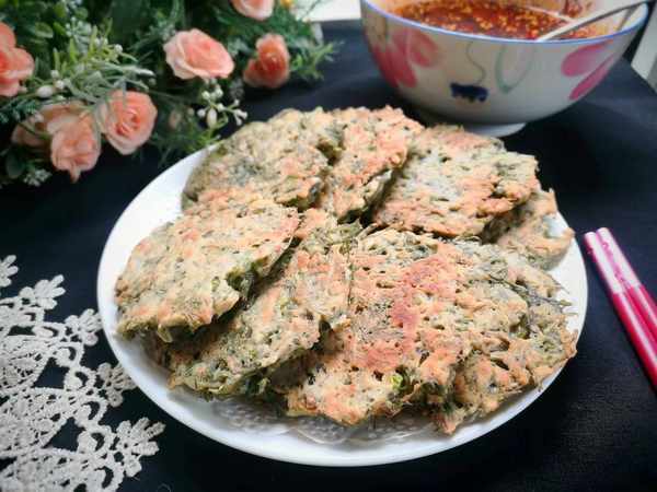 食材:白蒿、雞蛋、面粉,蔥花、鹽、胡椒粉。