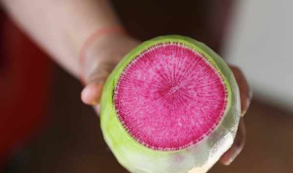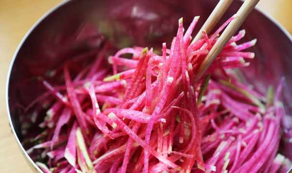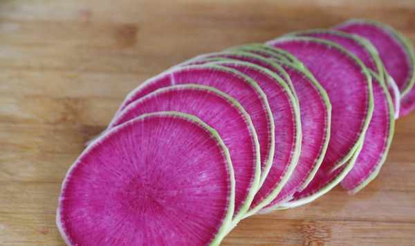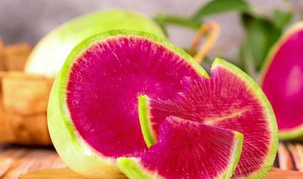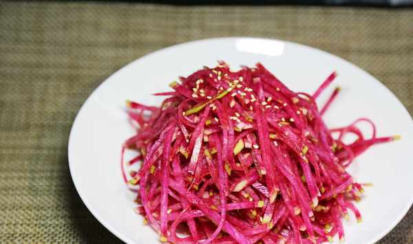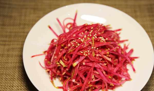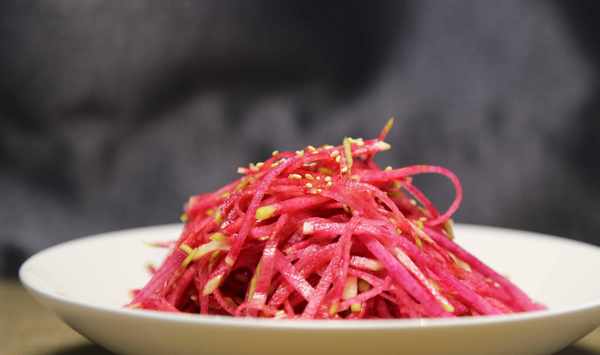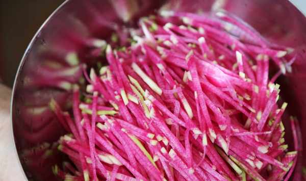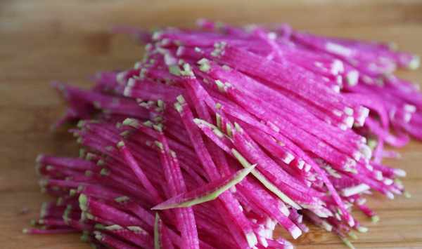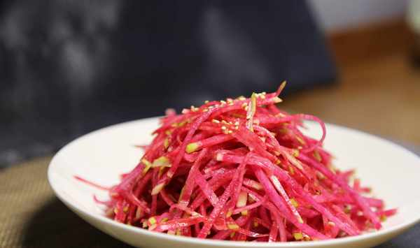“心裡美”是蘿卜的一種,主要在北方城市比較常見,在北京的菜市場賣蘿卜的攤位經常能夠見到它的身影,尤其是秋、冬季的口感最為清脆爽口。“心裡美”的汁液中富含花中素,屬於一種水溶性的色素,在酸性溶液中顏色偏紅,而在堿性環境中則呈紫藍色。所以在做涼拌“心裡美”時適量放些醋,除瞭能起到增味的作用外,還能讓蘿卜的色澤更加鮮艷,讓人看著就很有食欲。