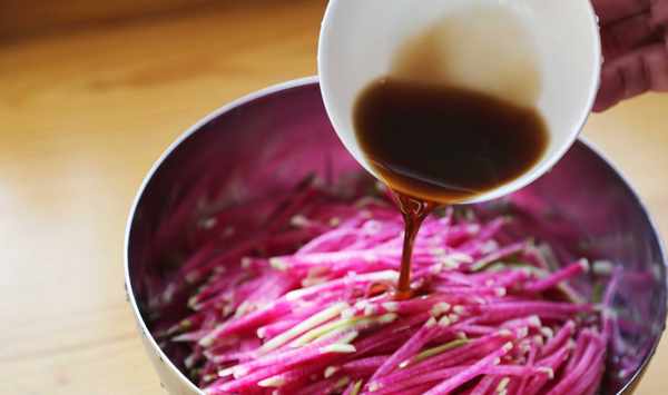 今天就做一道糖醋心裡美,調味料很少而且做法也非常的簡單,隻需要簡單一拌,就能品嘗到它的清脆爽口。還有一點需要註意,一般在飯店裡制作的拌蘿卜,為瞭追求更加清脆的口感,會在切好絲後在冰水中浸泡十分鐘控水撈出再拌制。如果是在傢裡,我認為完全可以省略這個過程,這樣可以很好地防止蘿卜營養的流失。
