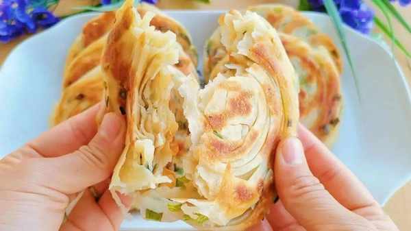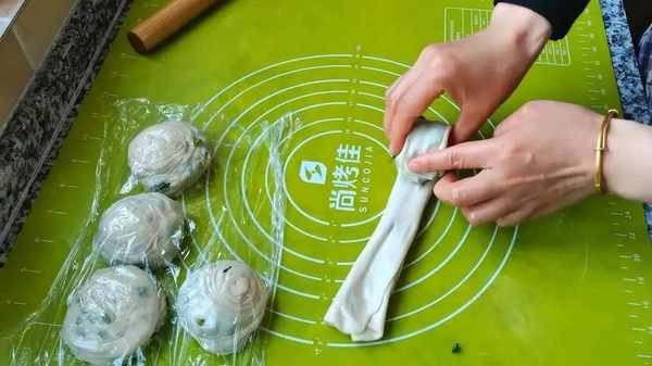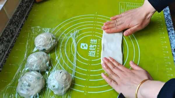 6.舀一勺油酥,塗抹均勻,撒一層蔥花。兩邊向內對疊起來。稍微按壓排氣,輕輕摔打拉伸。