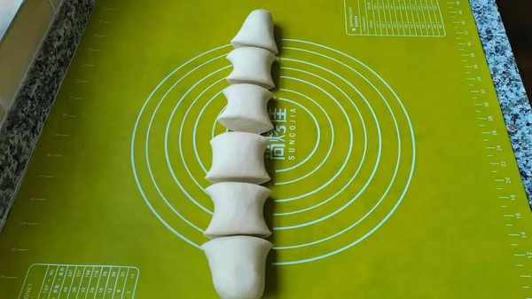 2.將面團移到矽膠墊片,揉搓均勻,搓成長條,均勻分塊。