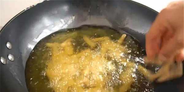 8.鍋中倒油,油溫五成熱的時候下入生坯,不要著急翻動它。五成熱的溫度大概就是看到鍋底開始冒起氣泡即可。