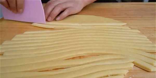 4.再切成寬度為1厘米左右的條。不要太粗哦,不然炸的時候不容易炸透。