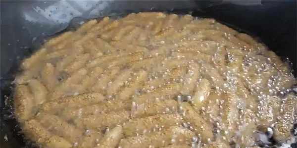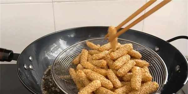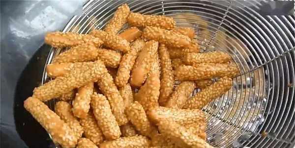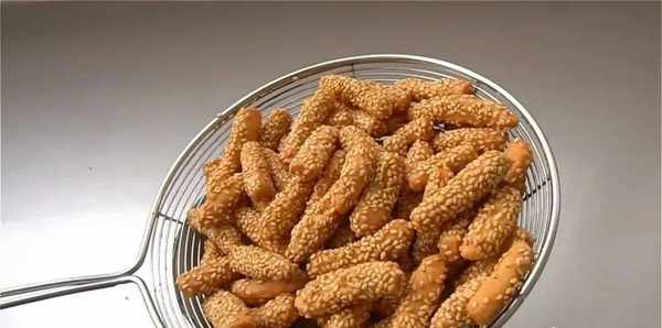 10.看到芝麻條變得微黃就撈出控油。