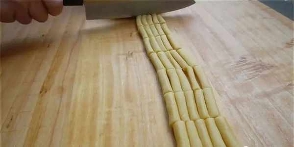 5.將長條稍稍搓均勻、圓潤一點。用刀分成大概5厘米左右的段。