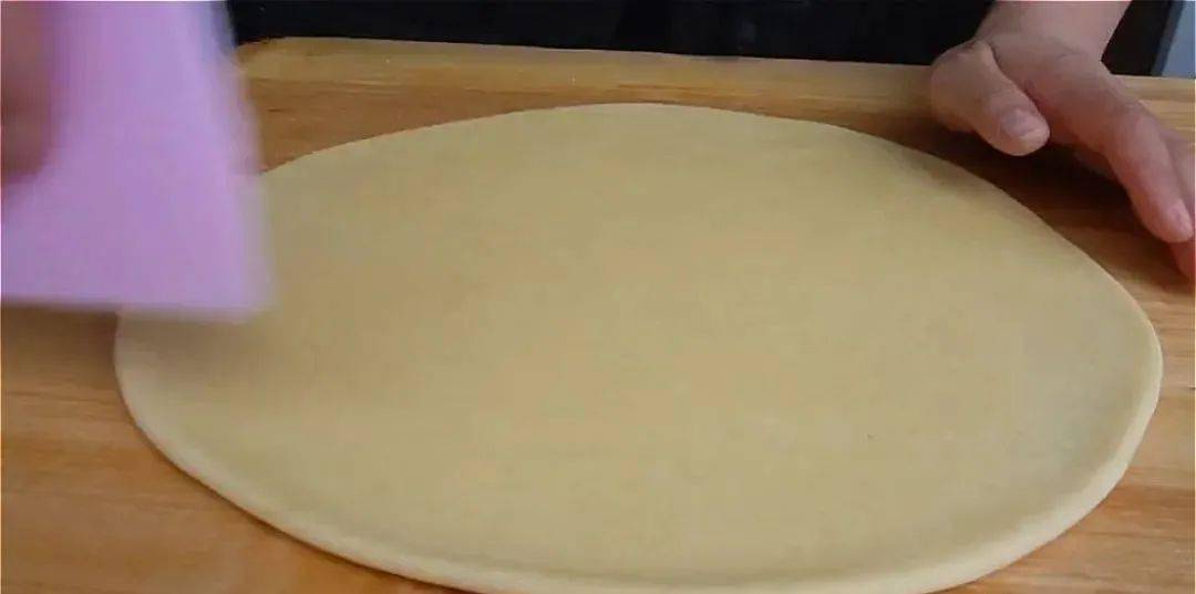 3.時間到瞭,不用再揉瞭,直接移到案板上,用搟面杖搟成厚度0.2毫米左右的片。