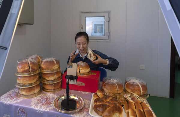 4月1日,在塔城市疆趣食品坊,員工薛怡凡在利用網絡直播向網友介紹“塔城奶酪包”。