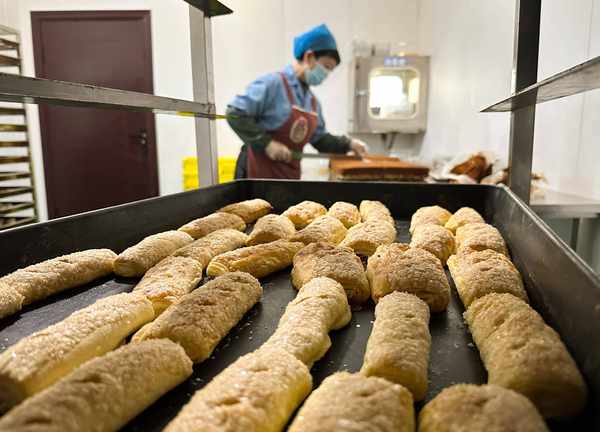 4月1日,在塔城市疆趣食品坊,員工們在制作“塔城奶酪包”。