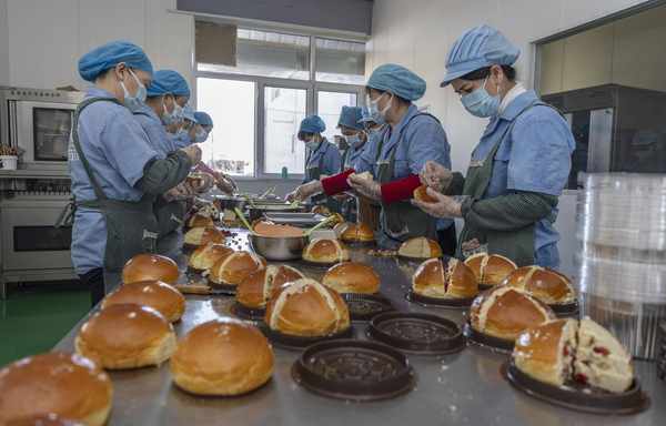 4月1日,在塔城市疆趣食品坊,員工在車間內進行糕點制作。