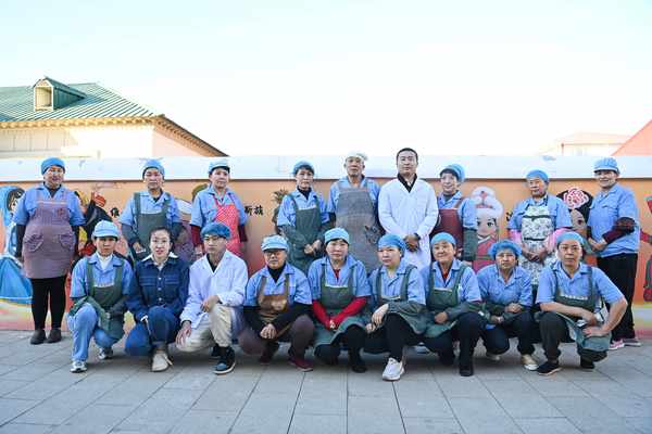 4月1日,在塔城市疆趣食品坊,食品廠創始人王會鵬(後右四)和部分員工在廠區內合影。