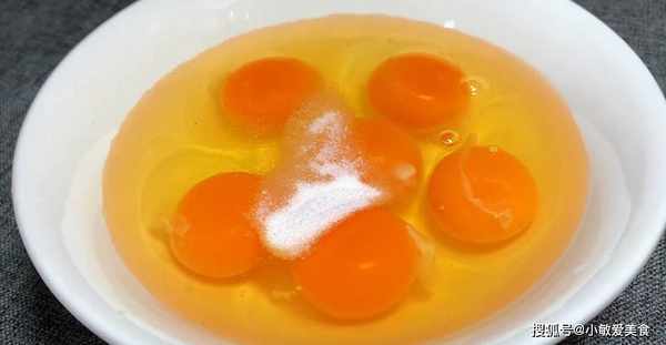 3、準備一個大碗,在裡面打入六顆雞蛋。再加入一勺鹽,增加底味,攪拌均勻。