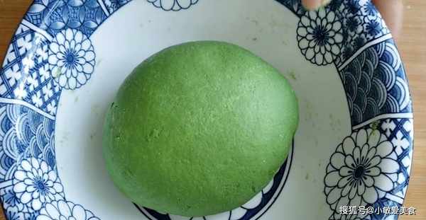 2、準備300克的普通面粉,加入一點點的小蘇打,用菠菜泥和面,揉成一個偏軟光滑的面團,蓋上蓋子,醒大概半個小時左右。