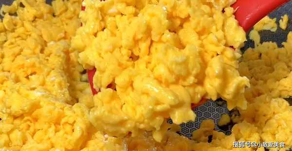4、鍋中倒入比平時炒菜多點的食用油,油溫燒熱以後,倒入雞蛋液,用筷子炒成雞蛋碎,炒的越碎越好,炒好關火晾涼備用。