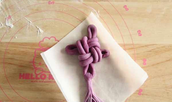 7、上端折下靠左,左端折到右邊靠下,下端往右上部折,右端往左上方折,最後穿過底下的孔洞。略微整理成結。