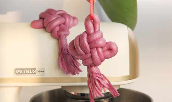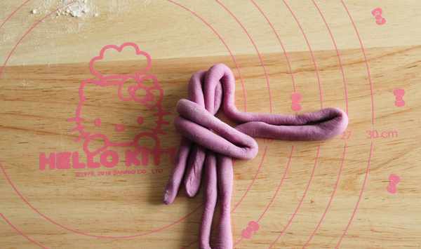6、取一面團搓成80CM長條,撒粉防粘。整理成十字形。接著按圖整形即可。