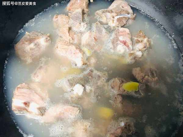 2、取砂鍋,把排骨放進去,再放入足量的水,下入薑片,蓋上蓋,大火燒開,轉小火,慢慢燉煮40分鐘。