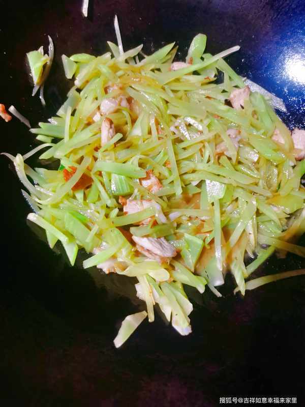 鍋中放油,油熱後放入肉片,肉片炒至焦黃後,放入大蔥,蔥爆香後放入萵筍絲,加入鹽、生抽、蠔油,一起炒至萵筍斷生即可,這樣一道美味又簡單的萵筍絲炒肉就做好瞭。