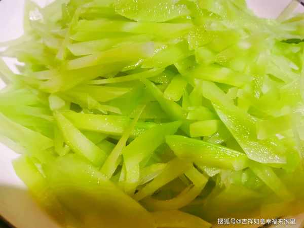 萵筍削皮,清洗幹凈後切絲,豬肉清洗幹凈切片,大蔥清洗幹凈,斜著切片,食材準備好之後,放入盤中備用。