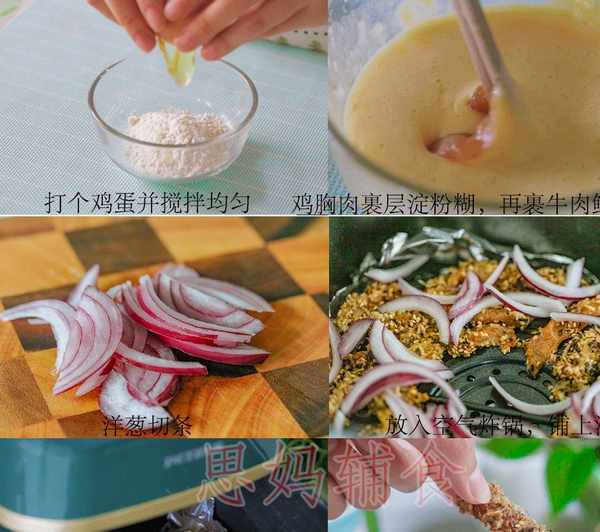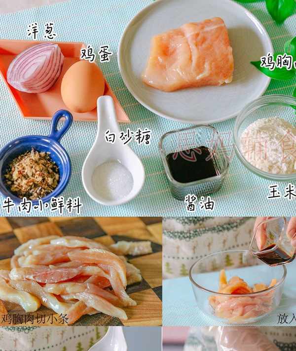 雞胸肉80克、牛肉小、白砂糖3克、醬油2克、玉米淀粉15克、雞蛋1個、洋蔥15克、鮮料20克