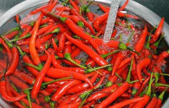 取紅辣椒800克,青辣椒200克,一個一個洗凈,再沖洗幹凈,放在通風處,攤開辣椒,盡快晾幹。隻有當它們完全幹燥後才能進行下一步。