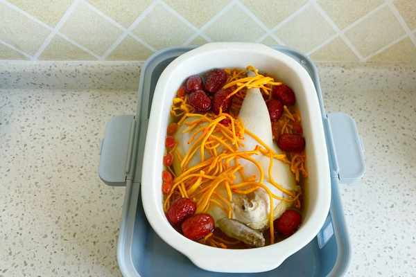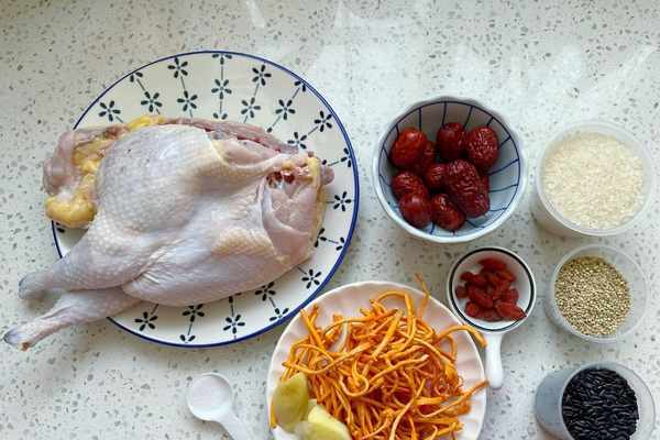【下燉—蟲草花母雞湯】:母雞1隻凈重800克,新鮮蟲草花50克,紅棗10顆,枸杞子20顆,生薑4片,鹽少許