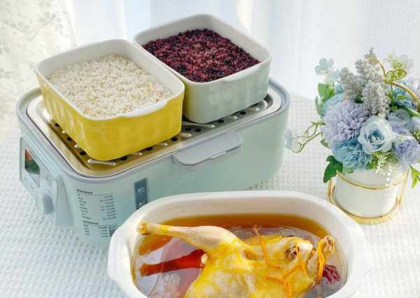 6、把裝有母雞的大燉盅放入蒸燉鍋裡,蓋上蓋子,從側邊的註水口加足清水至最大刻度。