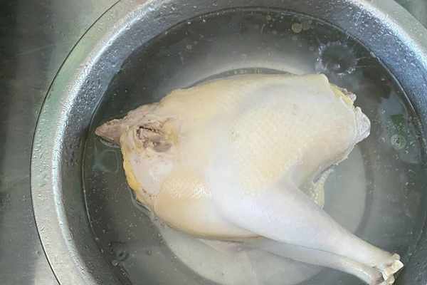 4、焯水後的母雞用溫熱水沖洗幹凈,一定記得不要用冷水,雞肉會收縮,咬起來費勁。