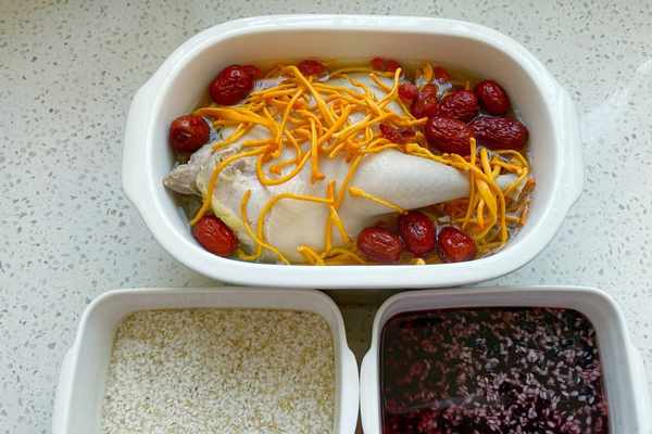 5、把洗幹凈的母雞放入燉盅裡,放入蟲草花、紅棗、枸杞、倒入熱水沒過雞身即可,藜麥米和紫米浸泡後吸足水分瞭,蒸制的時候不需要再加水瞭,看著水高過米粒即可。