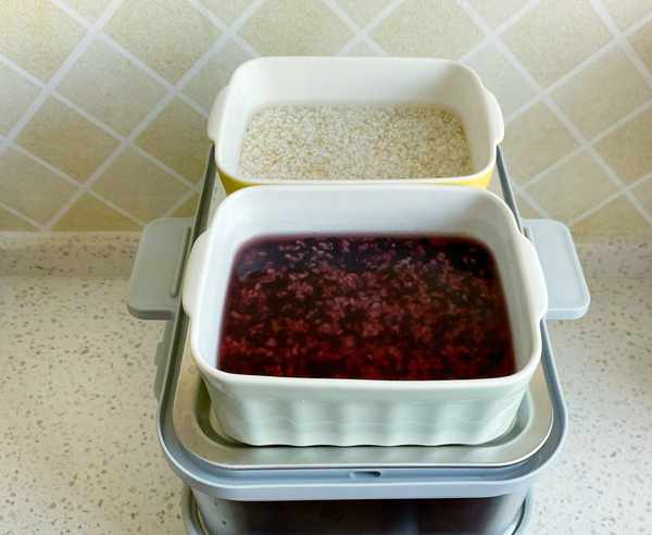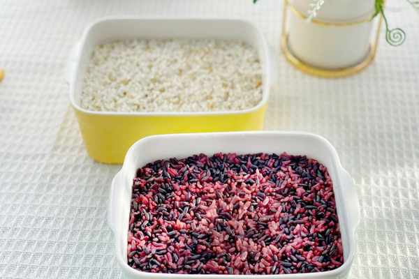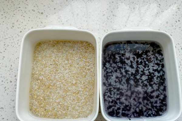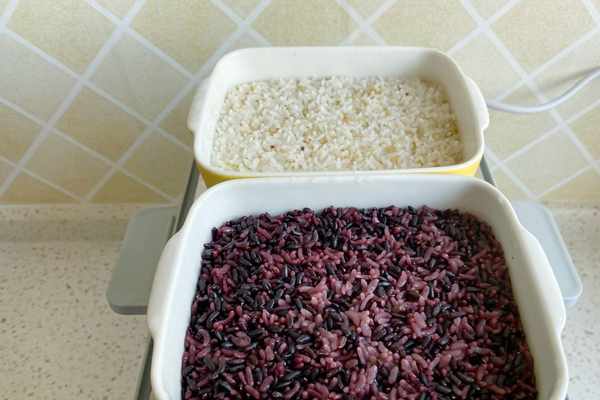 2、藜麥米飯的食材和紫米飯食材,清洗幹凈,加清水浸泡一會,米吸足瞭水分煮的時候香甜軟糯。