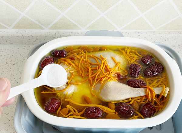 11、50分鐘以後,蒸燉鍋燉好母雞,自動進入保溫功能,打開鍋蓋,加入少許食鹽調味拌勻,香濃美味的蟲草花母雞湯就做好瞭。