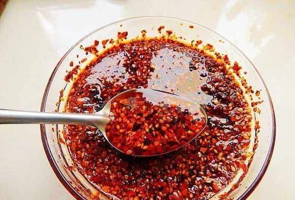 重新加熱鍋中的油。50%熱時,加入大蔥、花椒和薑絲,炒香。然後關火,濾掉熱油。油,紅油中加入蒜末、生抽、香醋、糖、鹽少許、香油少許、花椒粉、雞湯攪拌成醬汁。
