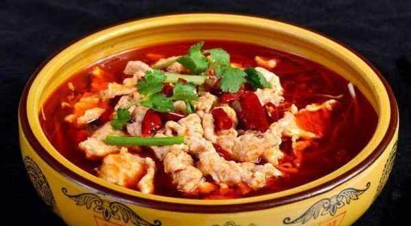 第三步:在炒鍋中放入適量食用油,等油溫升到50%左右熱時,再將80克火鍋底料放入鍋中,等火鍋底料炸好,適量加水,待水開後,將醃制好的肉片放入湯中,待變色後撈出裡脊,盛入邊上的大湯碗中。