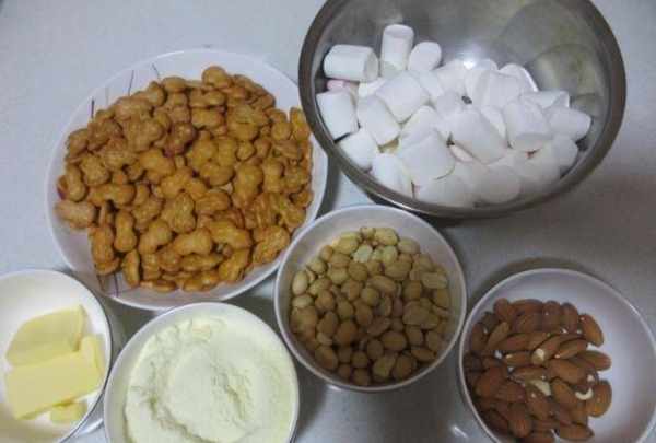 首先準備好必要的材料:棉花糖、蔓越莓幹、堅果、餅幹、奶粉、杏仁、黃油。