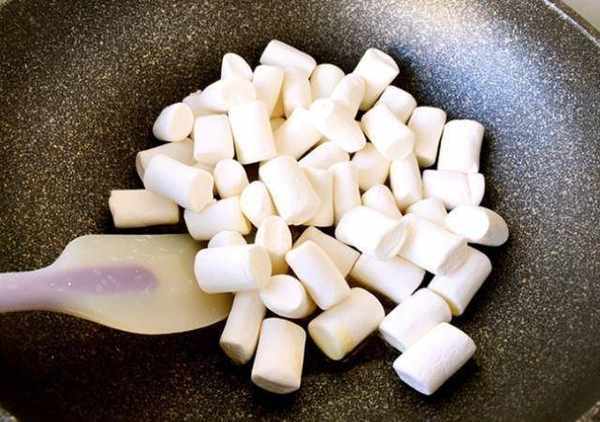 第三步:放入鍋中,出鍋後,放入黃油,轉小火,讓黃油慢慢融化。黃油融化後,加入棉花糖。(第二個小竅門,買棉花糖的時候,最好選擇純白色的棉花糖做牛軋糖,這種棉花糖油炸後口感更好,不會變硬。)等棉花糖炸軟後,加入蔓越莓幹和堅果。平底鍋,快速攪拌。