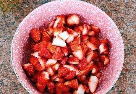 2、處理幹凈的草莓時,一定要控制好表面的水分,不能有紅水,否則做好的草莓醬不容易保存。草莓不要切太多,切小一點就好,這樣好的草莓醬會有顆粒感;