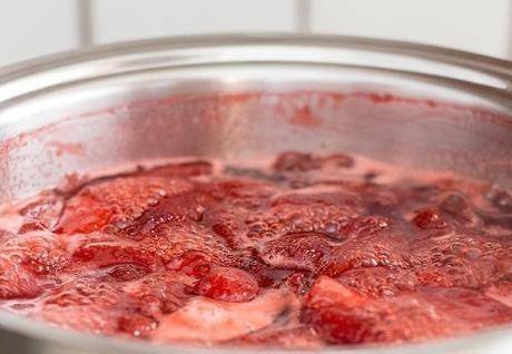 第五步,待草莓醬的體積比原來明顯減少後,可以轉小火收汁,用矽膠刮刀刮一下,很容易流動,草莓醬就做好瞭是,讓它冷卻並倒入預先消毒的瓶子中。
