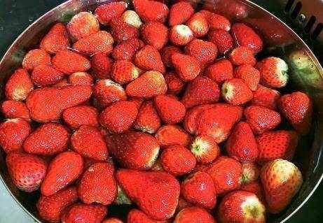 制作過程:第一步是準備適量的草莓。做果醬的草莓不必太大也不必太甜,小一點也沒關系。草莓必須在淡鹽水中浸泡一會兒;