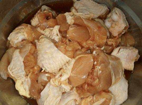 買回來的雞腿肉洗凈,切成大塊,放入碗中,用薑絲、燒酒等醃制。很多人不做這一步,以為雞肉燉好瞭,就可以瞭味道,所以這一步就省略瞭。這一步一定不能省略。加入料酒可以去除腥味,使雞肉更入味。