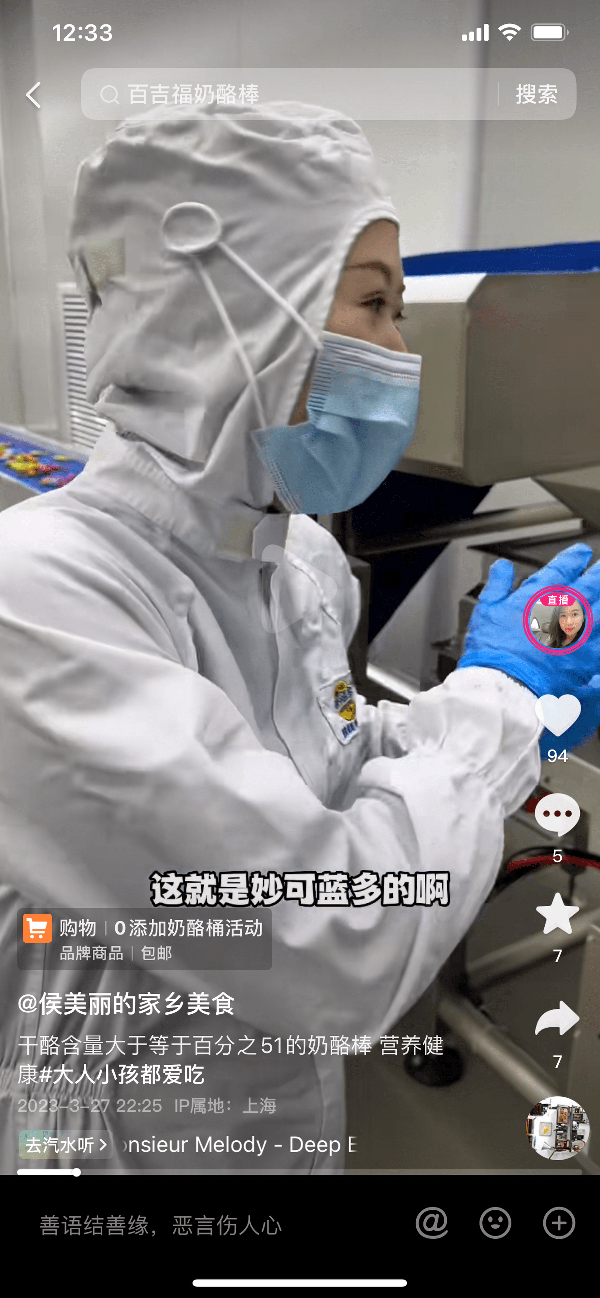 3月27日,抖音大V“侯美麗的傢鄉美食”侯美麗在妙可藍多位於上海的總部大樓,對新品慕斯奶酪棒贊不絕口。