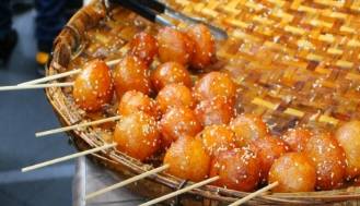 第3個糖油果子。這個是成都的傳統風味小吃,是用糯米粉和秈米粉為主料,加上紅糖和菜籽油炸制而成,炸過以後裹上白芝麻餅用竹簽穿起來就可以瞭,外觀看起來色澤黃亮,吃一口外酥內糯,香甜可口,據老師傅說炸的最好的果子裡邊是空心的,那麼糖油果子的價格也不貴,每一串上面差不多有四、五顆,在成都有很多的人都是非常喜歡吃的。