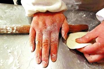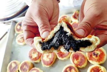 下午兩點,記者來到徐裕泰糕團店,看到門口排起瞭兩條長長的隊伍。蒙蒙細雨中,人們打著傘靜靜等待著酒釀餅出爐。糕團店裡,徐勝師傅一傢三口,分工明確,女兒和妻子負責制作酒釀餅,母女二人將隔夜發酵完畢的面團,分割成大小均勻的小塊,然後搟皮。接著她們熟練地將面皮包入餡料後搓圓、按扁。徐裕泰糕團店的酒釀餅有玫瑰、豆沙、芝麻、豬肉、咸菜五種不同的口味,她們會在面餅上放一點餡料作為“記號”來區分不同餡料的面餅。徐勝則負責煎制,他在加熱的鍋底淋上菜油,鋪上面餅煎一次,然後翻面再刷上菜油,再煎一次,幾分鐘後,掀開鍋蓋,香味從爐中噴湧而出,兩面金黃的酒釀餅就新鮮出爐瞭。剛出鍋的酒釀餅,外殼金黃酥脆,一口咬下去,綿軟的餡料充斥整個口腔,細細咀嚼,又有一股淡淡的酒香味殘留於齒頰之間,讓人欲罷不能。兩爐酒釀餅在短短幾分鐘之內就被一搶而空,門口的隊伍越來越長。