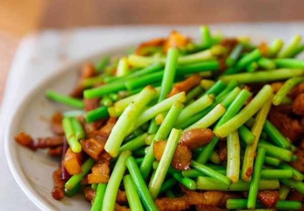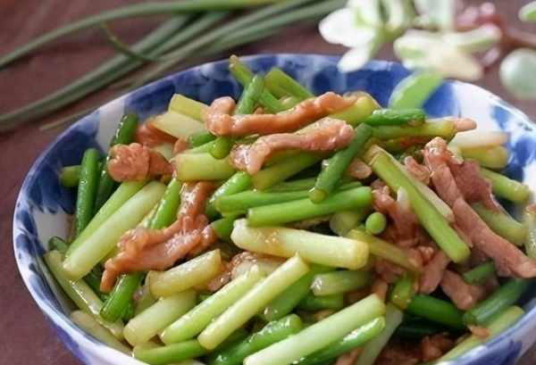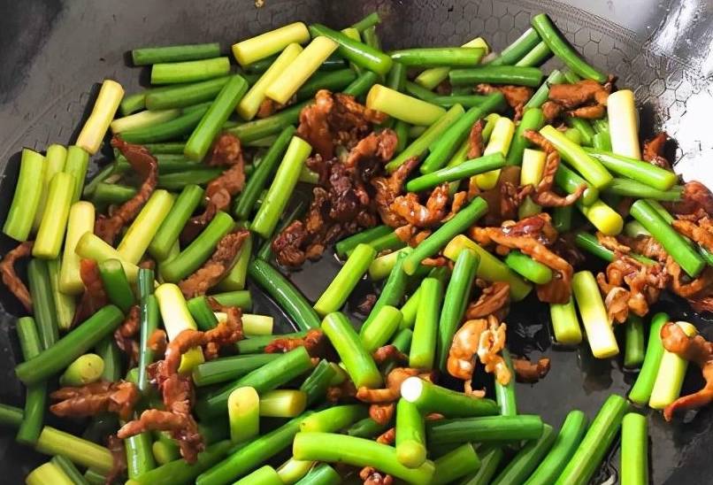 第四步:在鍋中留底油,如果油比較少的話,再加一點油,然後把切好的薑絲倒進鍋中,翻炒出香味之後倒入蒜苔,快速翻炒,把蒜苔炒變色,並且香味飄出來之後,在鍋中加入適量的生抽,翻炒均勻;最後把肉絲倒入鍋中,加一點鹽和雞精,翻炒均勻就能關火出鍋瞭。