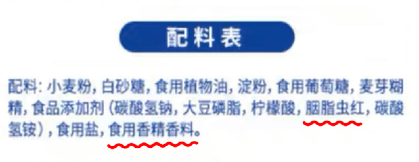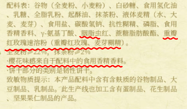 一款標稱櫻花風味的餅幹,配料表中沒有任何與櫻花有關的成分,但有不少食品添加劑和食用香精香料。